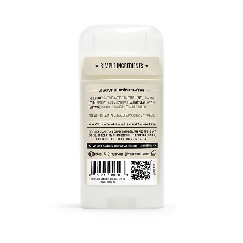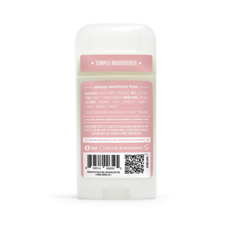 Cornstarch: Cornstarch is a natural ingredient that is highly effective at absorbing moisture, resulting in a drying effect that still allows the body to sweat. Fractionated Coconut Oil: Fractionated coconut oil is processed to be liquid at room temperature and has a stable shelf life. It is rich in Capric and Caprylic acid which exhibit antioxidant properties while offering a silky smooth texture that's suitable for customers with sensitive skin and won't clog pores. Beeswax: It moisturizes the skin, and provides that easy, glide-on feeling we all love in Humble. All-natural Baking Soda: Baking Soda absorbs and neutralizes body odors without subjecting the skin to harmful and unpleasant chemicals. It's naturally derived so you know that you are getting the best that nature has to offer. Essential Oil: Found in our scented varieties, essential oils provide calming and aromatic essences to Humble. Our Formulations Specialist prioritizes choosing essential oils that are of the highest quality and sustainably harvested.