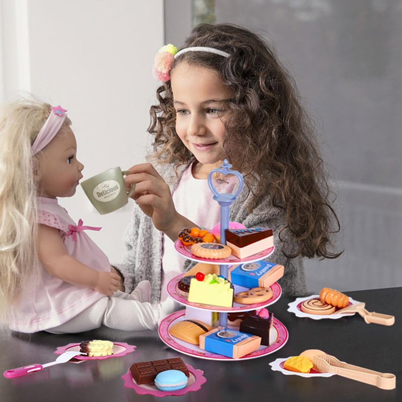 - Super Value Tea Set for Little Girls - 30 PCS pretend dessert food set include 1 gift box, 3-tiered cake stand(made of 7 pieces), 4 plates , 2 forks, 1 cake shovel, 1 cake tongs, 2 pastry box, 19 sweet treats (doughnut, cakes, cookies etc). Rich pretend tea dessert accessories, let your little girls endless hours of tea time themed pretend role play.