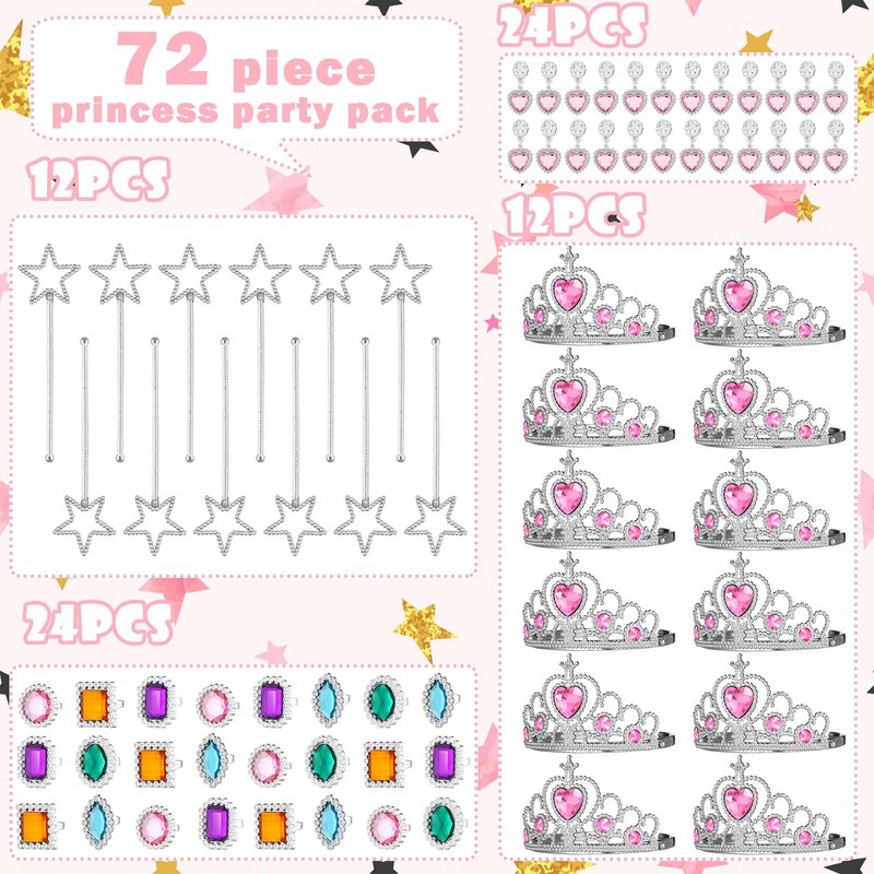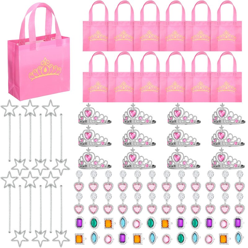 - Princess Party Decorations Set: package contains 72 pieces of princess party favors, including 12 pieces of party favor bags, 12 pieces of princess crowns, 12 pieces of wands, 24 pieces of rings, 12 pairs of earrings; Plenty to meet your child's different use, decoration and sharing needs