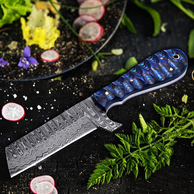 - [EDC BULL CUTTER KNIFE] This most durable and high-quality Sturdy Full Tang Knife gives the most cutting power and is more robust, durable, weighs less, and is more solid and is a solid piece of equipment when you hold it. Damascus Hunting Knife with Sheath is corrosion-proof and rust-proof, which means it will keep you busy for many years.