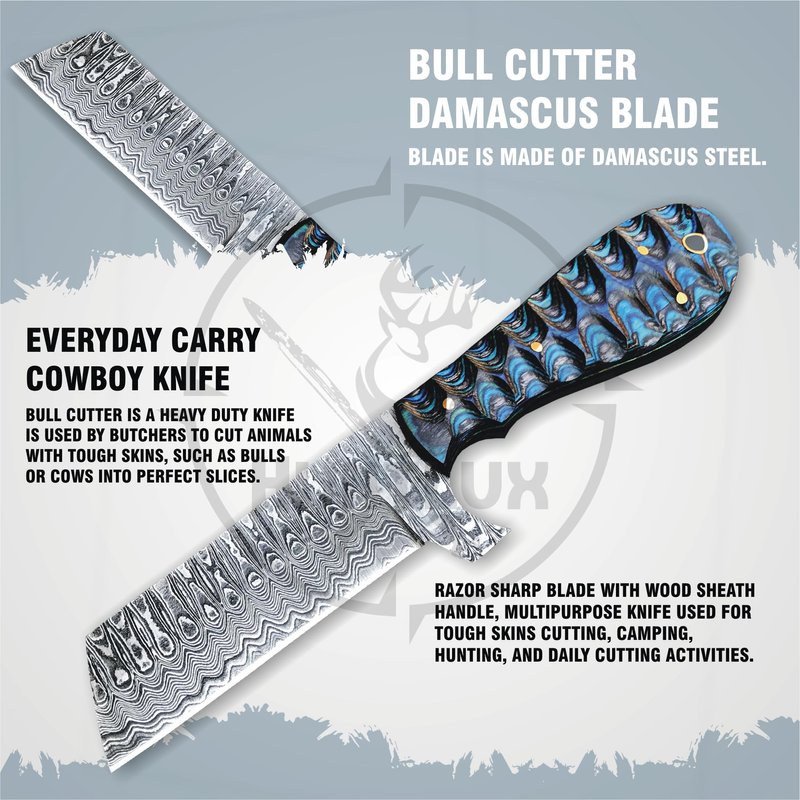 Are You A Camping Lover? Looking for the Heavy Duty EDC Fixed Blade Knife for your camping purposes? Look no further than our selection of Camping Hunting knives! We have options that are perfect for any budget, and each one is sure to serve as your go-to choice. ✔✔✔ Add This Beautiful HUNTLUX Handmade Damascus Bull Cutter Knife with Sheath in Your Camping Gear ✔✔✔ Benefits And Usage of Camping Knife The benefits of a Damascus Hunting Knife is endless. Whether you're cutting Animal skins, meat or vegetables, a knife can make a big difference. Do you remember the last time that you required a handy blade? After getting this EDC Cowboy Knife with Leather Sheath, you will always have a Razor-Sharp blade within reach! Here are a few great reasons for carrying an EDC Knife everywhere you go. EASY TO USE: BULL CUTTER IS A HEAVY DUTY KNIFE IS USED BY BUTCHERS TO CUT ANIMALS WITH TOUGH SKINS, SUCH AS BULLS OR COWS INTO PERFECT SLICES. LEADERSHIP: Be the LEADER in the group with your Premium Damascus Knife with Sheath for camping, and outdoor adventures. SAFETY: You will feel safer while CAMPING with this BEAST with you! FISHING: From cutting lines to removing hooks, a trusty Full Tang Knife is a mandatory must-have tool for any fisherman. CUTTING ROPE, WIRE, OR TWINE: This beautifully crafted knife will not disappoint you as survival gear/ hunting gear. GUTTING AND SKINNING: You can use this Skinning Knife for gutting and skinning their kills. The exceptionally sharp cutting edge makes quick work. Luckily, you have family and friends to present a Beautiful Outdoor Cowboy Knife as a gift—whether it's tied to a precise occasion or not. As we have made this beautiful Knife Handle with Wood Sheath which you like the most. If it makes their time outdoors more enjoyable, there's no time like the present to dive into camping gifts for your loved ones. BEST FOR Hunting Gifts Camping Gifts Anniversary Gifts Groomsmen Gifts