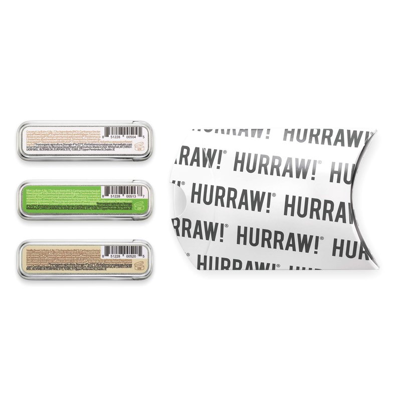 - THREE Slim Slider Tins of HURRAW! Lip Balm packaged in a white HURRAW! branded pillow box. COCONUT Lip Balm (Rich, raw coconut oil enriches the fabulous flavor of this balm. Not too beachy, a little toasty... coconut perfection.) MINT Lip Balm (Awesome tingle and crisp that provides a long lasting minty treat for your lips!) VANILLA BEAN Lip Balm (The tiny speck, vanilla bean seed lingers. You might even find one! A delicate, dreamy vanilla scent.) A Luxury Lip Balm MADE IN THE USA.
