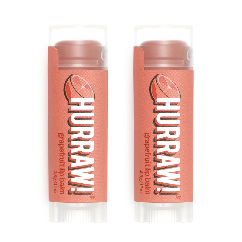 - TWO 4.8g/.17oz Oval Tubes of Grapefruit Lip Balm packaged in a white HURRAW! branded pillow box. Zesty fresh! Let our pink grapefruit balm invigorate your zenses. Possessing a beautifully pink in-tube appearance but only a clear gloss is left on the lips. Made with certified organic, vegan, and raw ingredients. Hurraw! Lip Balms are certified 100% all natural origin, cruelty and gluten free. Non-GMO. Bee, Shea, Soy and Palm Free.