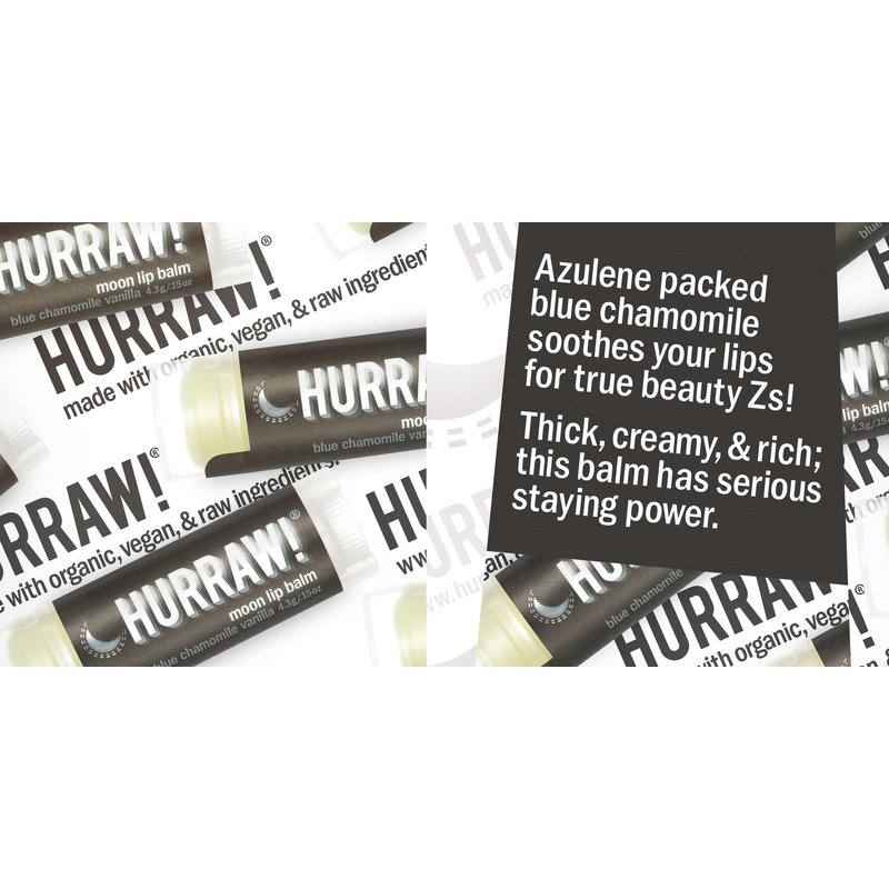 - TWO 4.8g/.17oz Oval Tubes of Moon (Night Treatment) Lip Balm packaged in a white HURRAW! branded pillow box. Extra thick, creamy and rich; this balm has some serious staying power. The vanilla and peru balsam scent will lull you to sleep. Azulene packed blue chamomile soothes your lips for some true beauty z's! Made with certified organic, vegan, and raw ingredients. Hurraw! Lip Balms are certified 100% all natural origin, cruelty and gluten free. Non-GMO. Bee, Shea, Soy and Palm Free.