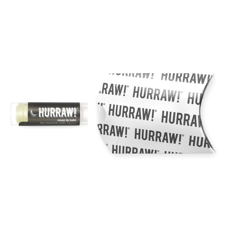 - ONE 4.8g/.17oz Oval Tube of Moon (Night Treatment) Lip Balm packaged in a white HURRAW! branded pillow box. Extra thick, creamy and rich; this balm has some serious staying power. The vanilla and peru balsam scent will lull you to sleep. Azulene packed blue chamomile soothes your lips for some true beauty z's! Made with certified organic, vegan, and raw ingredients. Hurraw! Lip Balms are certified 100% all natural origin, cruelty and gluten free. Non-GMO. Bee, Shea, Soy and Palm Free.