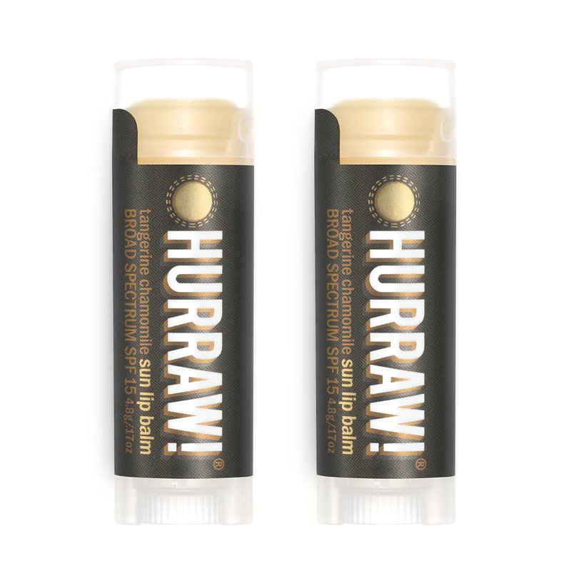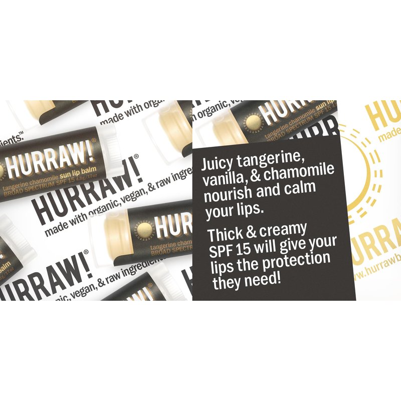 - TWO 4.8g/.17oz Oval Tubes of Sun Lip Balm (Tangerine, Chamomile) packaged in a white HURRAW! branded pillow box. Our zinc oxide broad spectrum SPF 15 Sun Balm can offer your lips extra protection. Glides on silky smooth & formulated to be extra thick and creamy for longer staying power while out in those shining rays! Made with certified organic, vegan, and raw ingredients. Hurraw! Lip Balms are certified 100% all natural origin, cruelty & gluten free. Non-GMO. Bee, Shea, Soy and Palm Free.