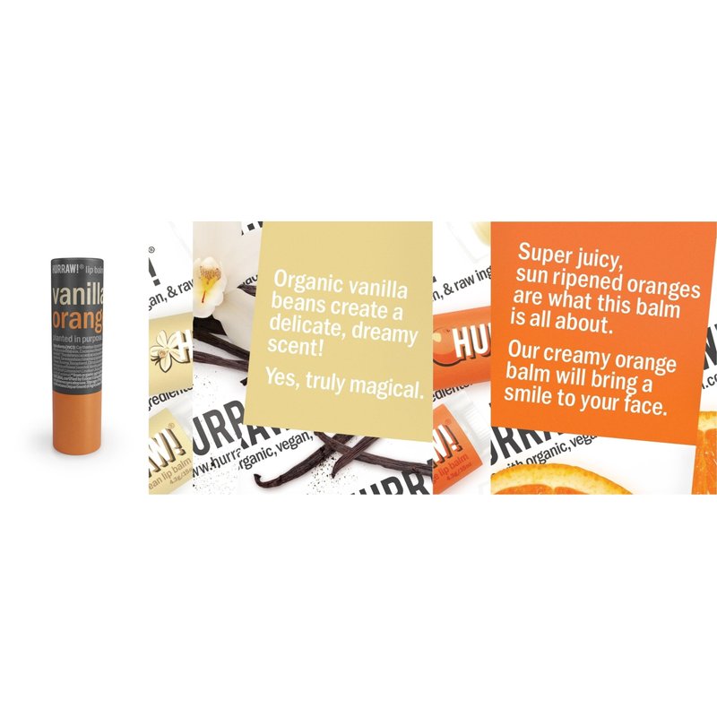 - ONE 4.8g/.17oz Round Cardboard Tube of HURRAW! Vanilla and Orange Lip Balm packaged in a white HURRAW! branded pillow box: Now in a PLASTIC-FREE cardboard applicator format. Yes …. We can save our EARTH! Made with certified organic, vegan, and raw ingredients. Hurraw! Lip Balms are certified 100% all natural origin, cruelty and gluten free. Non-GMO. Bee, Shea, Soy and Palm Free.