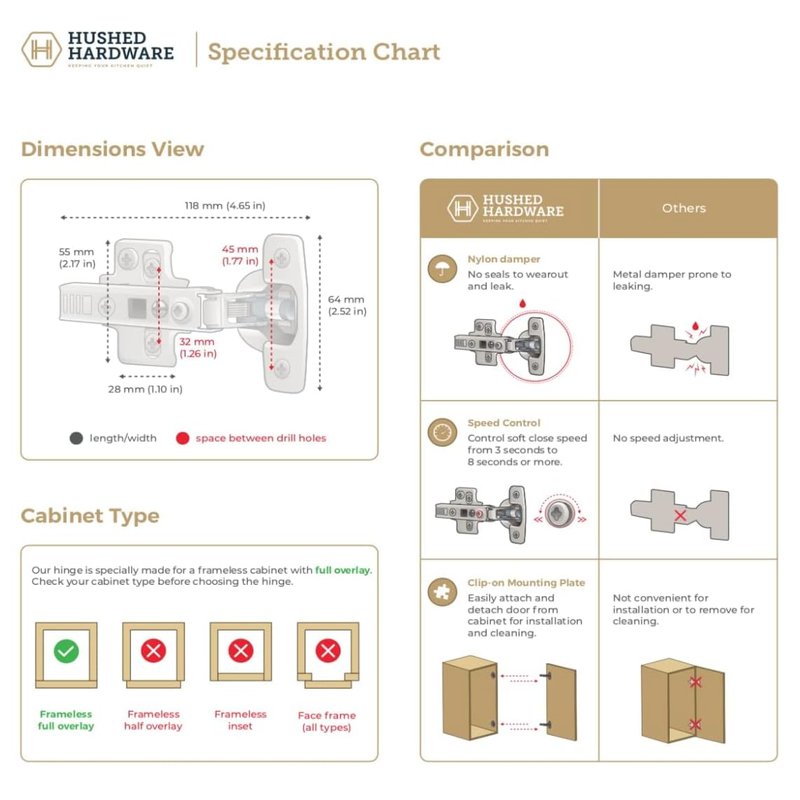 - 4pcs, Hinge + Mount Plate Easy and Fast ‘Clip’ Installation