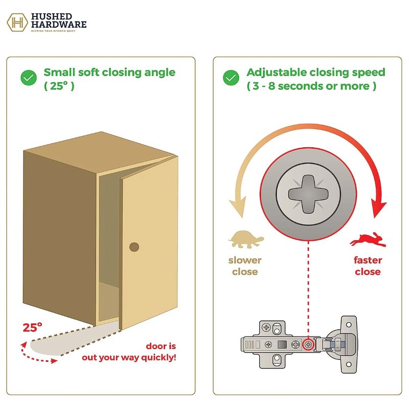 Some people like 2 seconds to fully closed, some 8 seconds or more. The beauty of Hushed Hardware Hinges is that you get to choose... because we all have a preference when it comes to the shut speed!