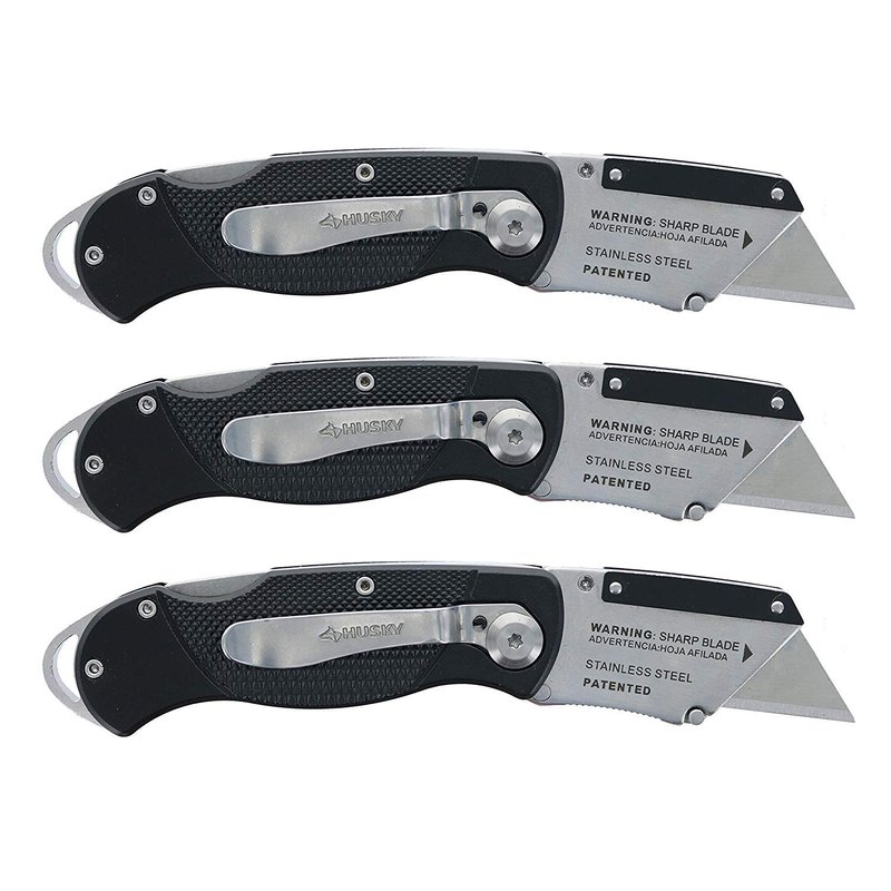 The Husky Folding Lock-Back Utility Knife (3-Pack) includes three knives and 13 utility blades. This knife features a quick-change blade mechanism that locks a standard utility blade in place for safety and efficient cutting. The handle is made of lightweight, durable aluminum for strength and features a convenient folding design. These knives are for use at home, on the job or outdoors.