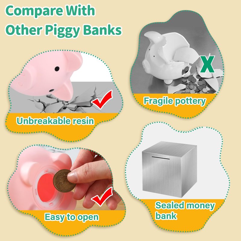 - MINI PIGGY BANKS FOR KIDS:This girls piggy bank has cute and attractive design,which makes kids love to store their spare money in this adorable coin bank friend and watching their savings grow.Plastic piggy bank can also be used as a decoration for your kid's room