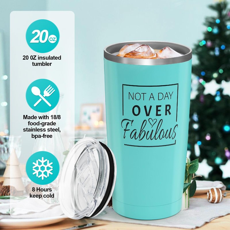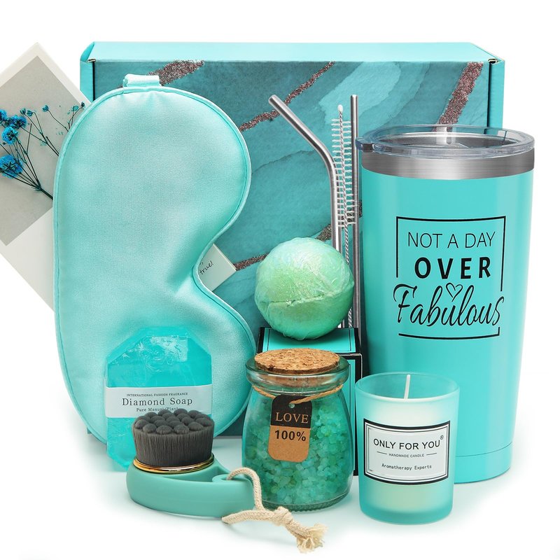- [THOUGHTFUL PACKAGING LIST] Our well-designed box contains an eye mask, a 20 oz. stainless steel insulated mug with the stylish words "Not A Day Over Fabulous" along with a straw and cleaning brush, a bar of Pure Diamonds Lavender Handmade Soap, a bath bomb, bath salts, a wax-scented candle, and a bath brush, as well as a greeting card with your special message.