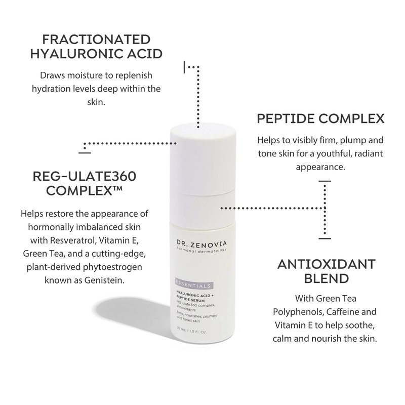 Hyaluronic Acid + Peptide Serum is an ultra-light moisturizing formula featuring fractionated Hyaluronic Acid and Dr. Zenovia’s proprietary REG-ulate 360 Complex to provide intense hydration and nourishment while helping to visibly plump skin. The exclusive phytoestrogen technology, known to help support the production of Hyaluronic Acid, collagen and elastin, delivers antioxidant and anti-aging protection for a supple, dewy, well-nourished and hydrated complexion.