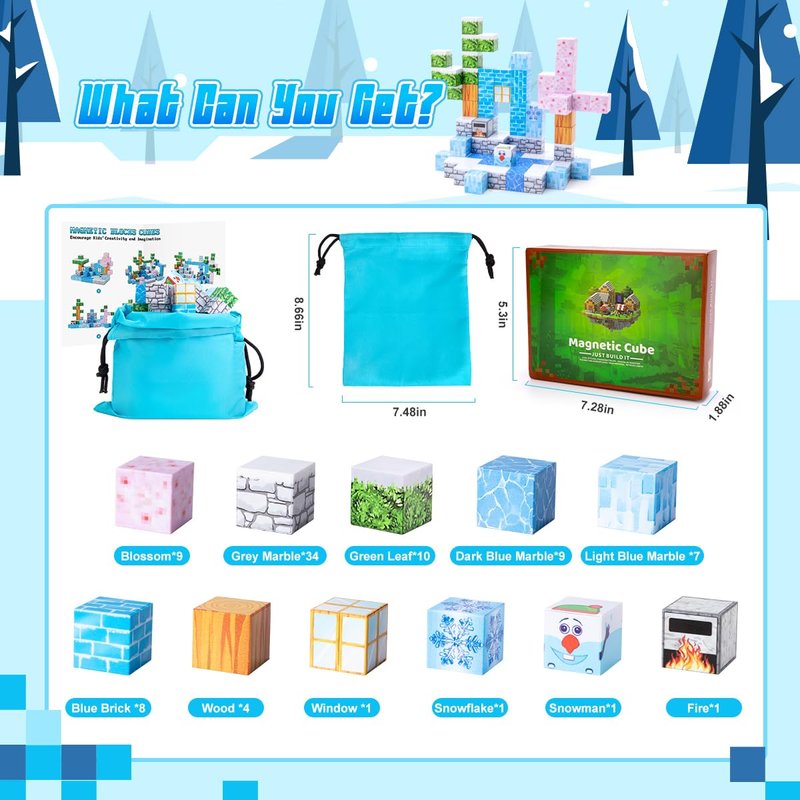 - 12 Patterns of Magnetic Constructing A Snow world Full of "Vibrant" & "Attraction". Comprising blossom*9, grey marble*34, leaf*10, blue brick*8, snowman*1 , etc. We offer 6 examples as the opening of kid's fantastic ideas. Abundant quantities and style to assist kids creating more shape and structures, like house, castle, tree, and a world of their own, which get kids excited by finding a new way of playing everyday.