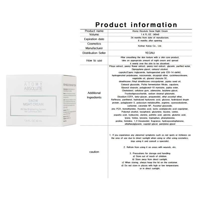 Hydrating Winter Cream with Moisturizing Formula, A Soft & Smooth Skin Appearance, For Atomy Absolute Snow NIGHT Cream (1.4FL.OZ / 40ml)