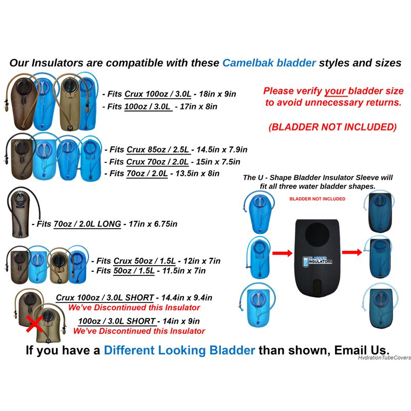 Hydration Tube Covers Bladder Insulators are Compatible with Camelbak Reservoir Water Bladder. Will fit MIL Spec Antidote and Crux