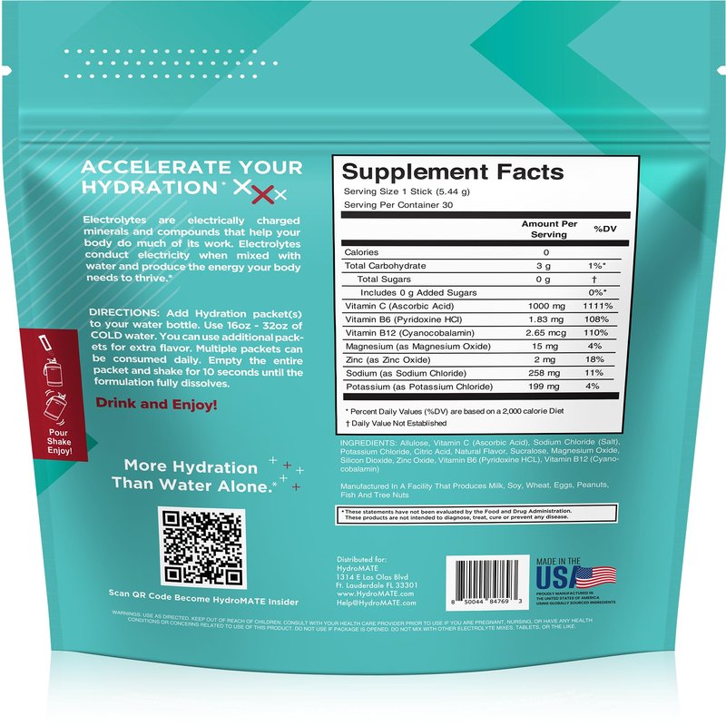 - 3x Faster Hydration than Water Alone HydroMATE Electrolyte Sticks