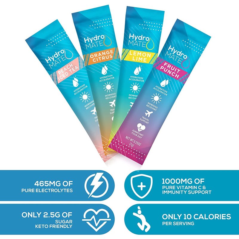 - HydroMate Multi Flavor Variety Pack Bag includes four Water Flavors Fruit Punch Peach Tea Lemon Lime Orange Citrus