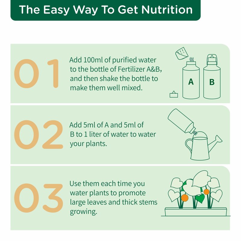 Must need to mix each nutrient with 100ml water in the correct proportions. And when adding fertilizer, we are equipped with a dispensing cup for convenient metering. Add 5ml A and 5ml B with each 1L water into your hydroponics system.