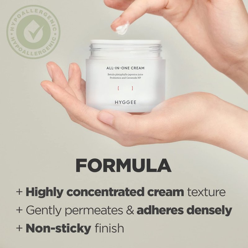 - ALL-IN-ONE CREAM WITH PLANT EXTRACTS: Hyggee anti-aging face moisturizer is made with the highest-quality ingredients and extracts that help restore the youthful glow and appearance of the skin. Our hydrating face cream contains Probiotics to strengthen skin barrier, Aqua Ceramide for moisture barrier, and Birch Sap to reduce dryness.