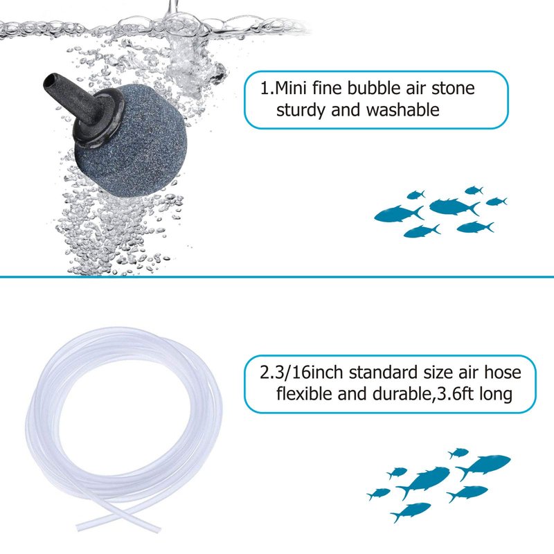 - 【One pack includes all you need】comes with all accessories you need to pump air into aquarium water, you don't need to buy extra accessories seperately. Package includes: mini air pump, air tubing hose, air stone, suction cup