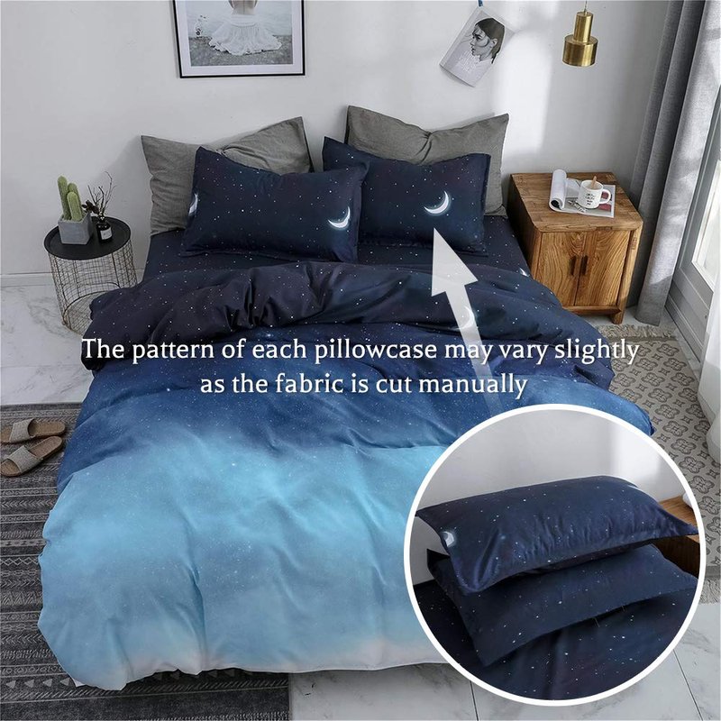 - Unique Design: A starry night duvet cover set, with galaxy moon and star printted on the top of the aesthetic duvet cover, which can easily match all kinds of styles room deco and brightens up your bedroom.And this patterned duvet cover is suitable for kids or teen bedroom,your girls or boys will definetely love this night sky theme bedding duvet covers.