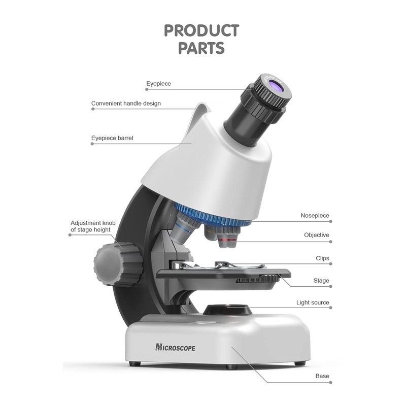 - ⭐ 【Children's Microscope】 Optical compound microscope with transmission LED light source, translucent specimens can be viewed from below illumination. Large focus knob, soft touch eyepiece and adjustable platform. Three levels of magnification and up and down illumination ensure a great view every time!