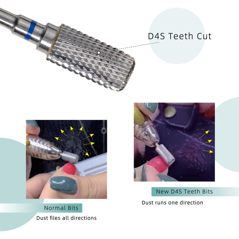 hytoos dust proof super clean nail drill bit, with sharp right-rotation and special D4S styel cut teeth, fast to remove nails gel works, important that on working the nail dust runs in one direction(but the normal bits dust runs all directions), that is good for manicurist, and flat top design safety for customers, top chamfer teeth can use for fingernail edge gel and cuticle clean. Teeth Cut Grit from XF, F, M, C, XC, 2XC, 3XC, 4XC, choose correct teeth, Suitable for natural nails, artificial nails, acrylic nails, gel nails, nail extensions, polygel, cuticle removal, nail polishing, nail shaping, etc. meeting your different needs for nail art design.