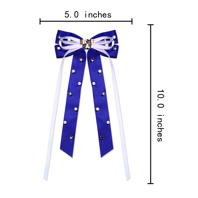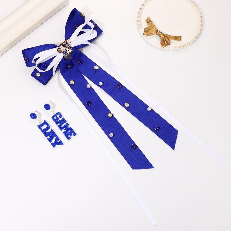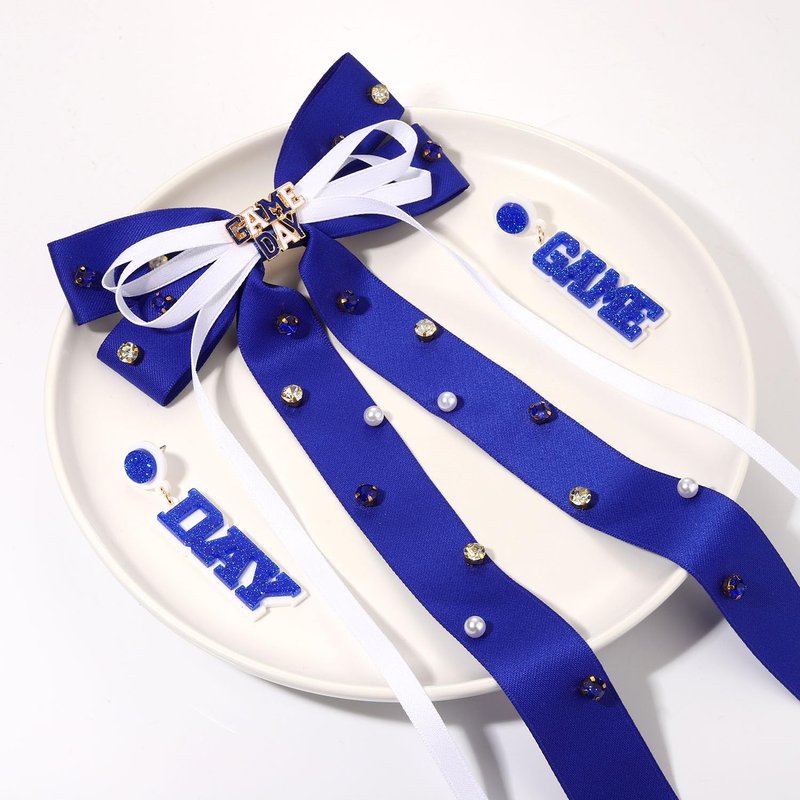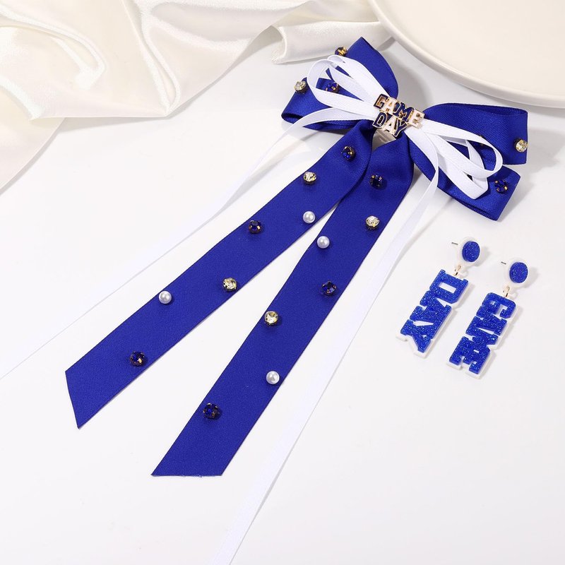 - Get game day ready with our long and eye-catching game day hair bows for women. Our game day accessories featuring classic Bow-knot design two tone blue and white long tail silky satin bow hair barrettes adorned with sparkling red white crystals and GAME DAY charms. It has a metal barrette on the back for an easy clip in style. Matching a pair of letter GAME DAY earrings in your favorite team colors. Perfect for showing off your game day spirit. Elevate your game day outfits for women with this fun sports hair accessories for women at the next tailgate or sporting event.
