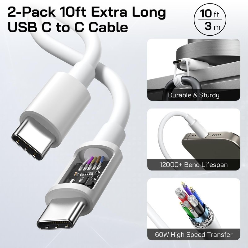 - 10FT Long USB C i Phone 15 Charger Cord: Attached 2-Pack 10ft USB C to C cable combined with 2pack i Phone 15 charger pro max block ensures that your daily charging needs for almost all your devices. Built in intelligent chip, the i Phone 15 charging cable supports 20V/3A (60W) power output and 480Mbps data transfer between devices.