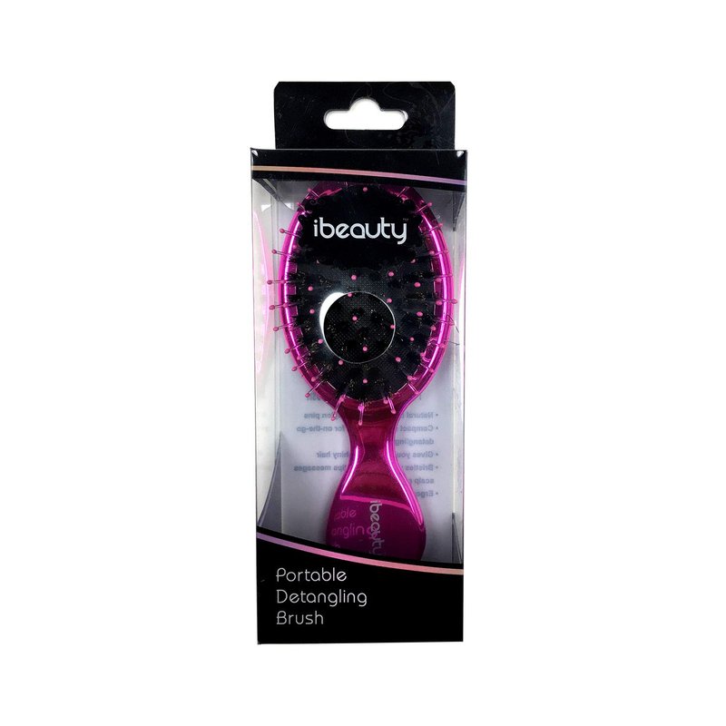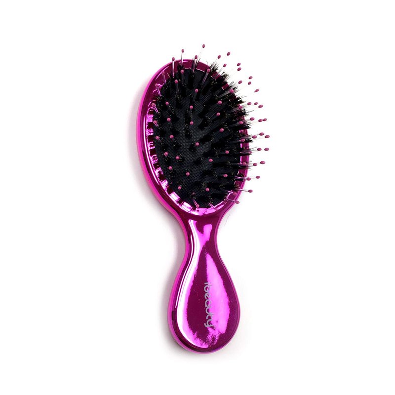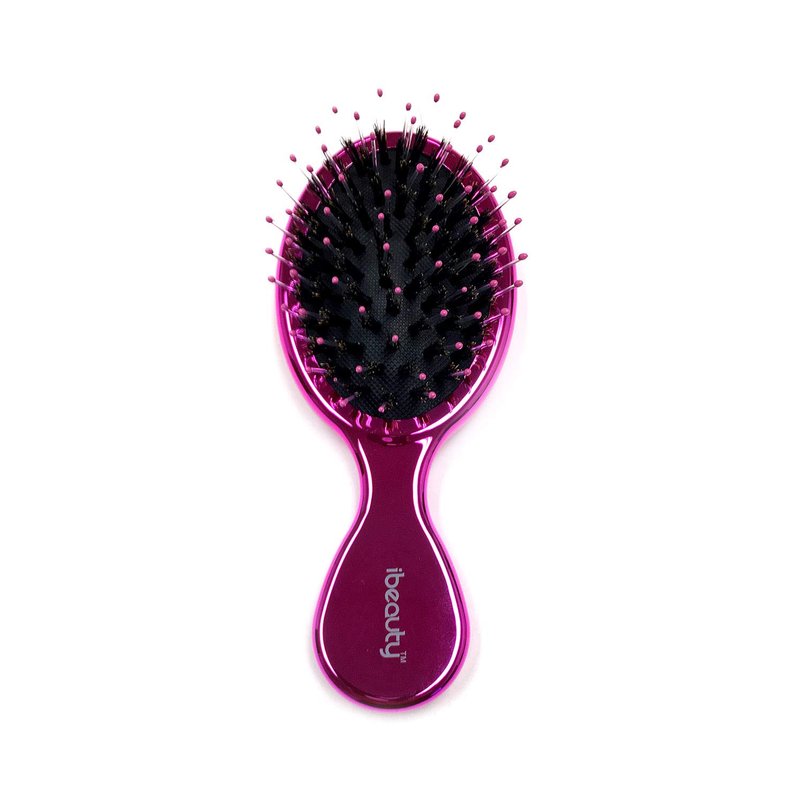 This is iBeauty Natural Boar Bristle and Soft Nylon Pins Portable Mini Detangling Hair Brush with soft cushion, metallic hot pink color.