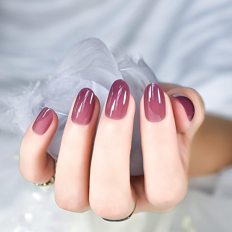 iBeautying Press on Nails - Taro Red Pure Color Semi-Transparent False Nails | UV Gel Finish Medium Short Small Round Shape Reusable Fake Nails - 24 Nail Kit with Jelly Glue Pad