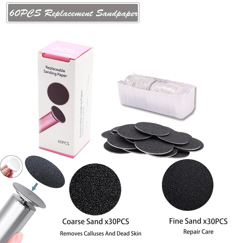- 【With 60PCS Self-adhesive Replaceble Sandpaper Discs】Self-adhesive sandpaper,easy to paste and replace. With 60pcs replaceble sandpaper discs, meeting your different needs. (30 pieces rough sandpaper, suitable for quite dry and rough heels, and the other 30 pieces is fine sandpaper,which is more suitable for soft skin), meeting your different needs.