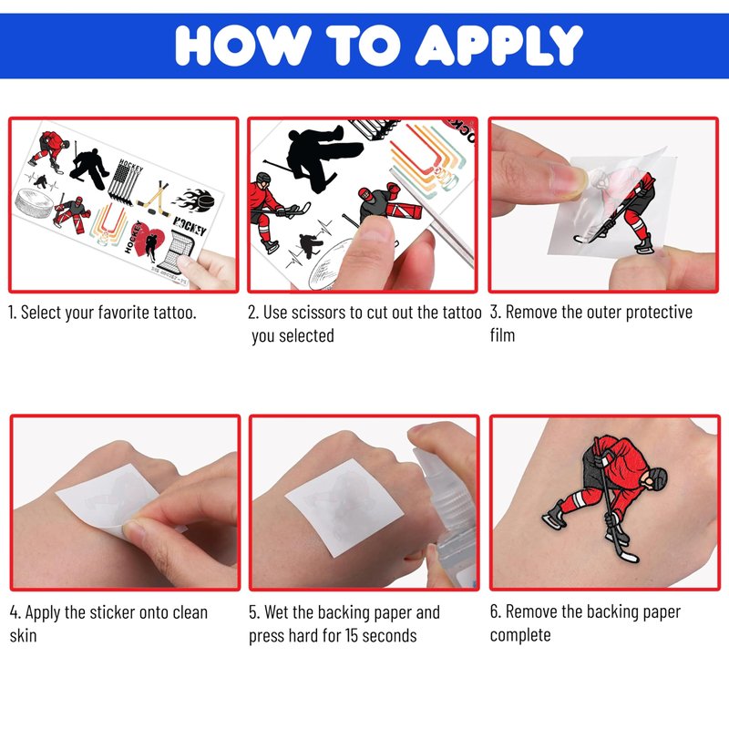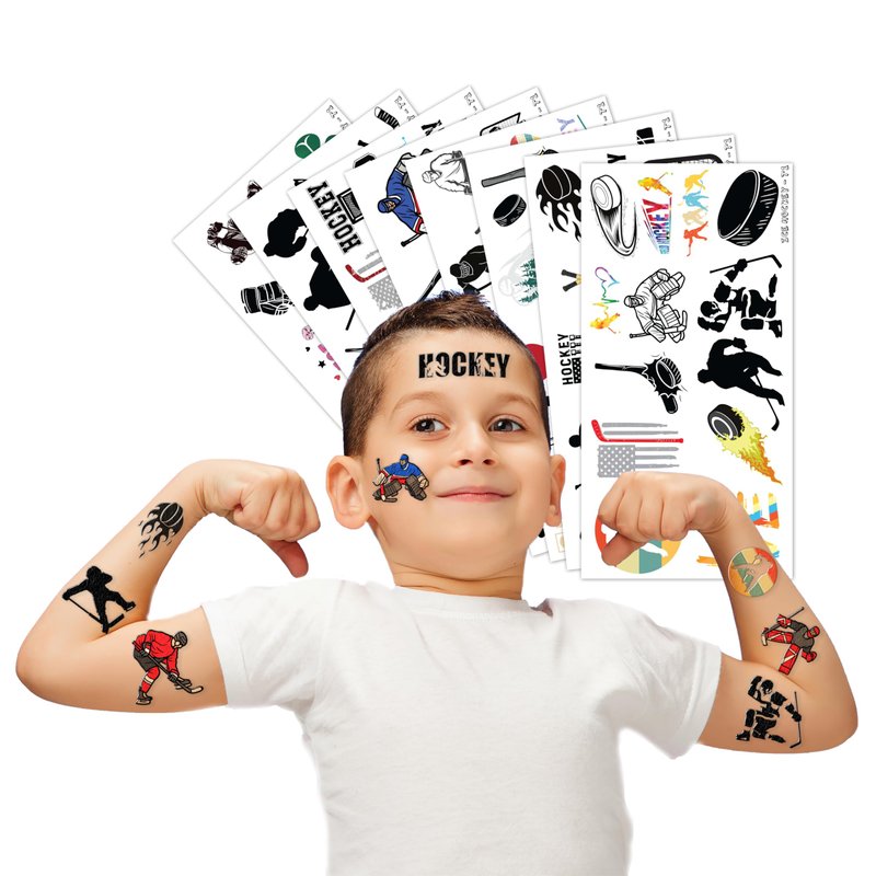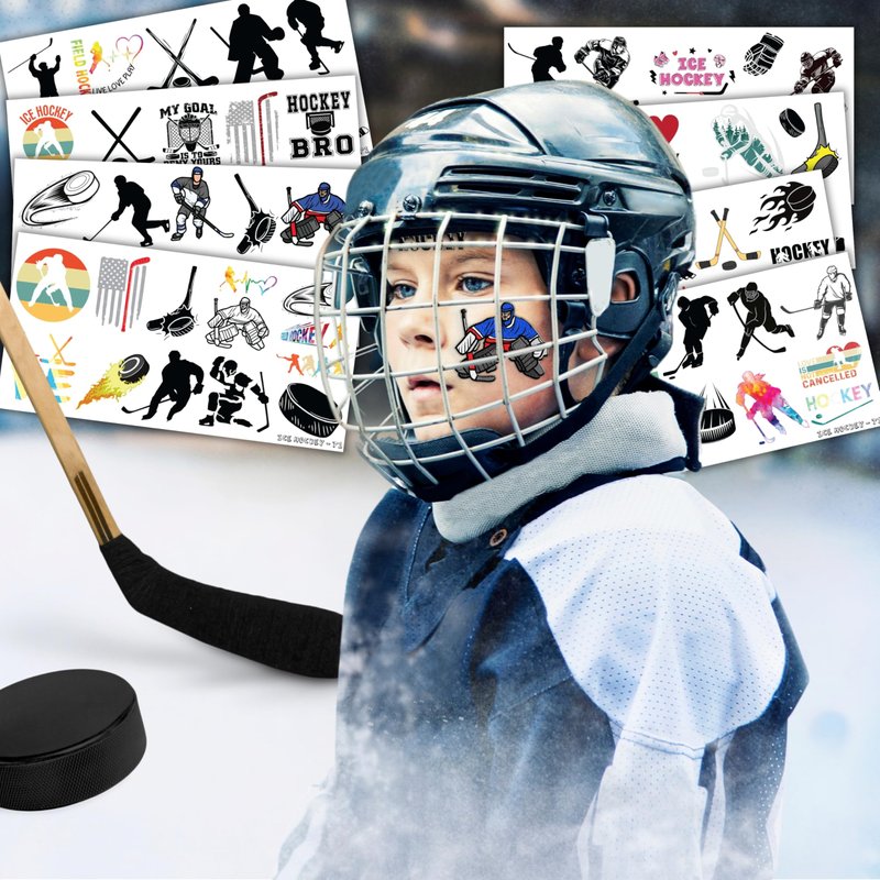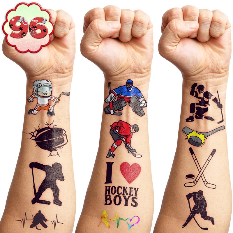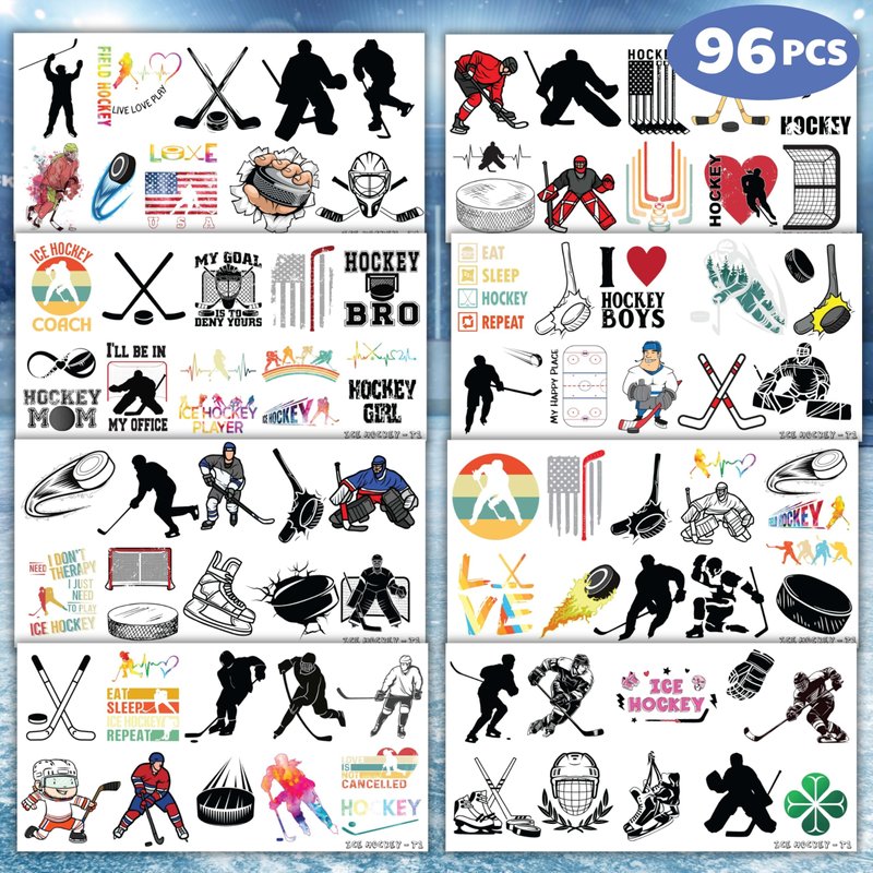 🎉🏒【PERFECT TATTOOS FOR THEMED ICE HOCKEY DECORATIONS】: ICE HOCKEY temporary tattoo stickers include 8 sheets in total. There are 96Pcs super cute tattoo differences. Perfect for giving out party favors and holiday theme small gifts. The size of each sheet is 6.1 * 3.1 inches. One size fits kids. 🎁【GREAT GIFT IDEAS FOR ICE HOCKEY PARTY SUPPLIES AND DECORATIONS】: You will receive many compliments when you decorate your child's birthday party with a ICE HOCKEY, Sport, Winter theme. ICE HOCKEY tattoos are a small gift you should not pass up for your kids. 🌍【SAFE AND ENVIRONMENTALLY CONSCIOUS】: Our temporary tattoos are made from materials that are safe and prioritize sustainability. These tattoos are created using paper that is both safe for users and friendly to the environment. 🥳【ADD A TOUCH OF FUN】: Are you tired of mundane gifts? We've got you covered! Our collection of adorable and vibrant temporary tattoo designs can be applied to laptops, backpacks, desks, suitcases, books, water cups, and more. These playful elements will surely elevate your visual experience and bring a touch of joy to everyday items. 🌴【EASY TO USE AND REMOVE】: Cut each tattoo out of sheets and remove the sheet clearly. You can stick it on your hands, face, arms or wherever you feel safe. Moreover, you put it down on glasses, clothes, and a smooth flat . After that, you wet it thoroughly with water and wait for 20-30 seconds, you get rid of the backing paper. As a result, you have a velvety tattoo as we say. 👍【PERFECT SERVICE】: If you have difficulty using our product, contact us. We will make sure to solve problems and help you have a wonderful buying experience.⚠️This product is not recommended for individuals with sensitive skin. We advise testing the product on a small patch of skin, such as the hand, to check for any allergic reactions to the ingredients before applying it to other areas of the body