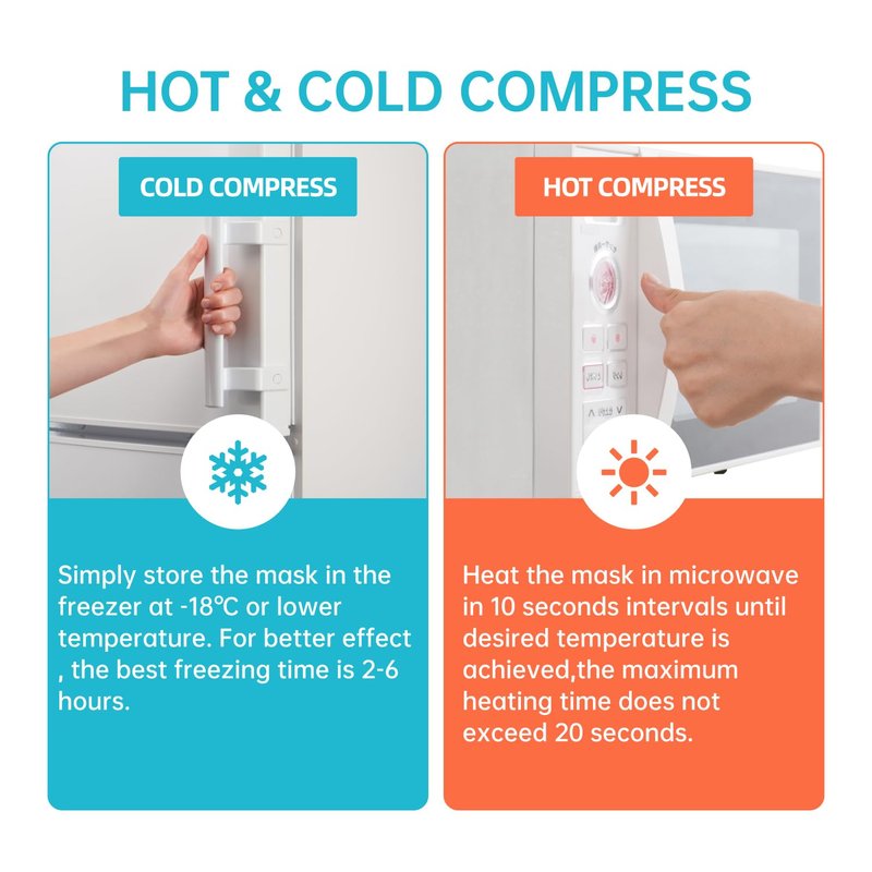- Cold & Hot Compress: Gel face mask cold pack fills with medical grade gel beads with good temperature storage, it can be used as a hot or cold compress. For better results, when used cold, the best freezing time in the refrigerator is 2-6 hours. Or heat in microwave oven for 10 seconds to achieve the heat therapy effect.