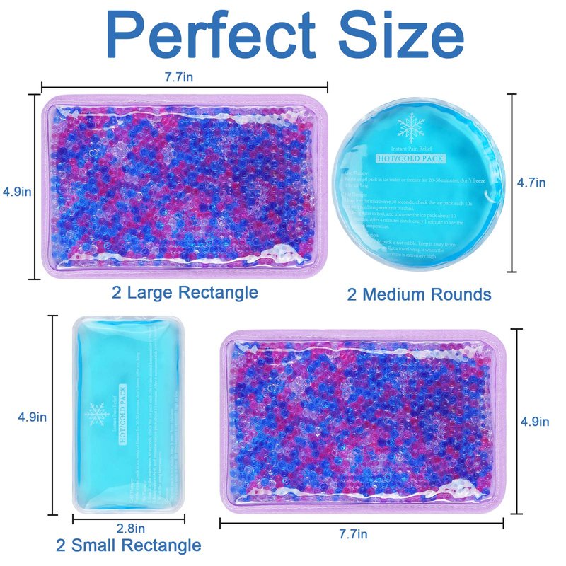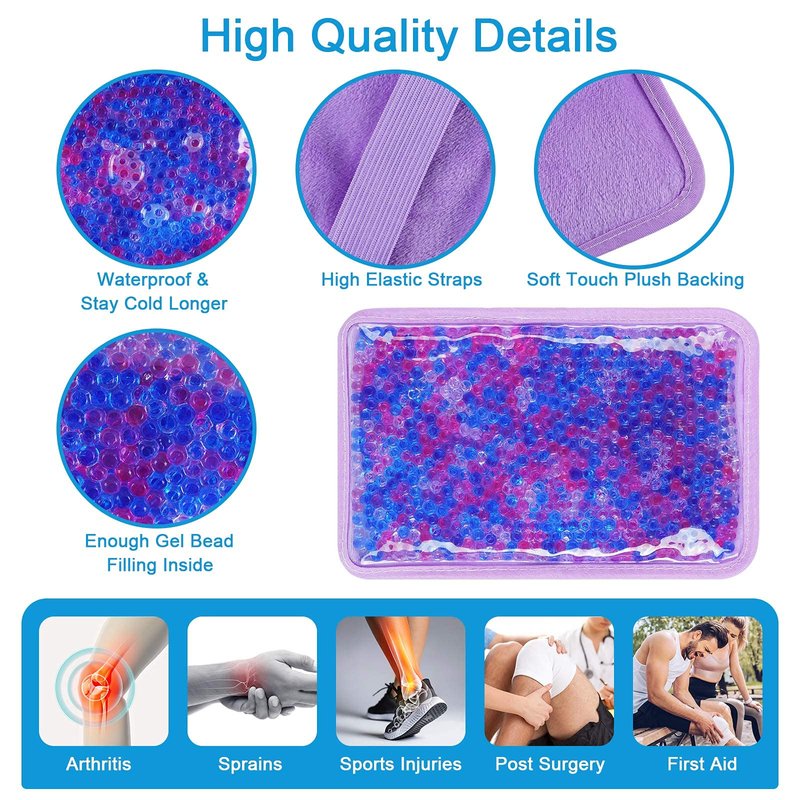 - VARIOUS SIZES & MULTIPURPOSE: The ice packs set includes 3 different sizes included purple gel bead ice packs and blue gel cold compress which can meet your daily ice pack needs. They can be used for chronic migraine relief, toothache, muscle soreness after exercise, neck and back ankle pain, children's falls, fever, etc.