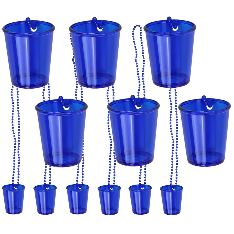 - These durable plastic shot glasses hang on a matching-color beaded necklace so your drink is always at hand