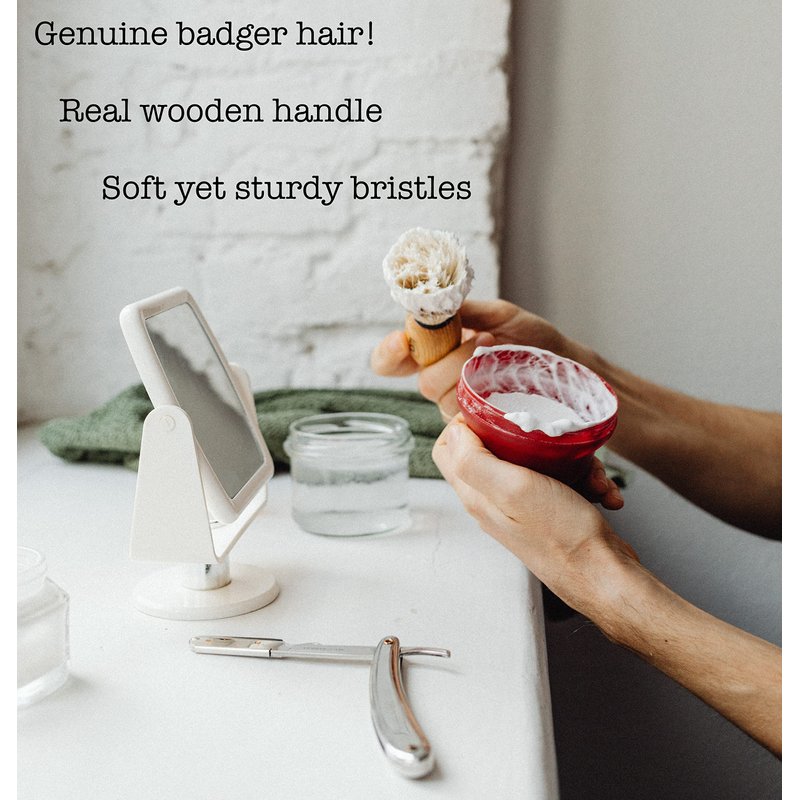 - The real wooden handle and badger-hair bristles will look and perform great as part of your shaving kit!