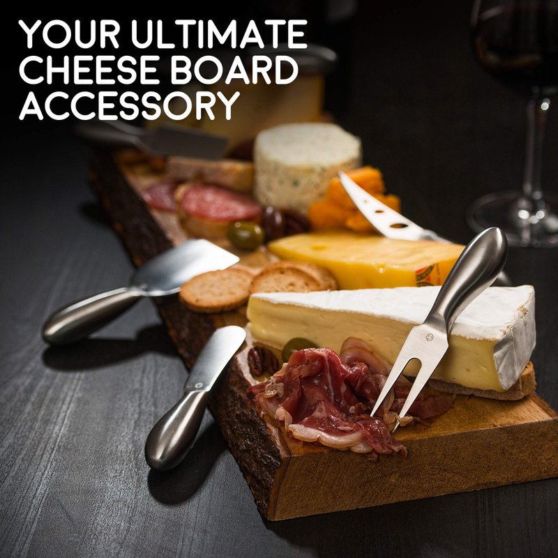 - 🔪 PREMIUM FEEL AND SLEEK DESIGN: Crafted entirely from high-quality stainless steel, each knife in this cheese board set has a premium feel and showcases a modern design. From the meticulously crafted blade to the brushed handle, these elegant cheese utensils will add the perfect finishing touch to your charcuterie board!