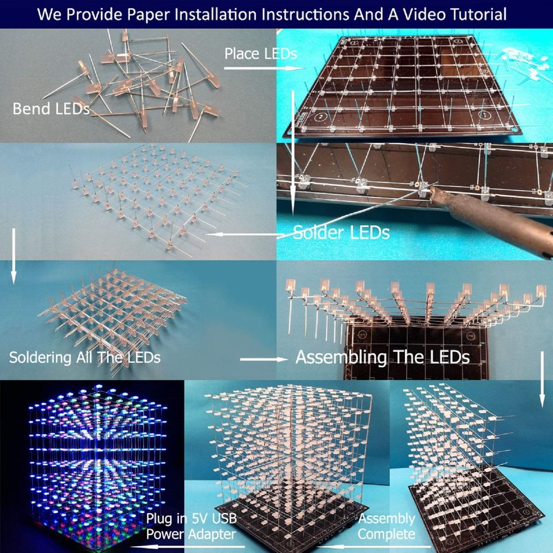 - [LED CUBE KIT] This is a DIY welding package for 3D cube light, a 3D matrix made up of 512 red, green and blue square LED lamps, which can display a lot of colorful dynamic lighting shapes. It is suitable for students' manual electronic manufacturing courses and welding exercises. Meanwhile, it is also a pretty innovative and meaningful small gift. The size of the finished product after welding of this package is about 7.08*7.28*7.88inch, and the distance between the lamps is 0.9inch.