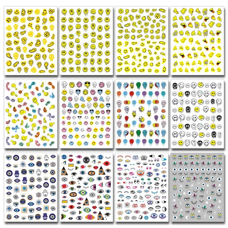IDDFEVE 12 Sheets Abstract Smiling Face & Evil Eye Nail Art Stickers, 3D Funny Nail Decals Self-Adhesive Designs
