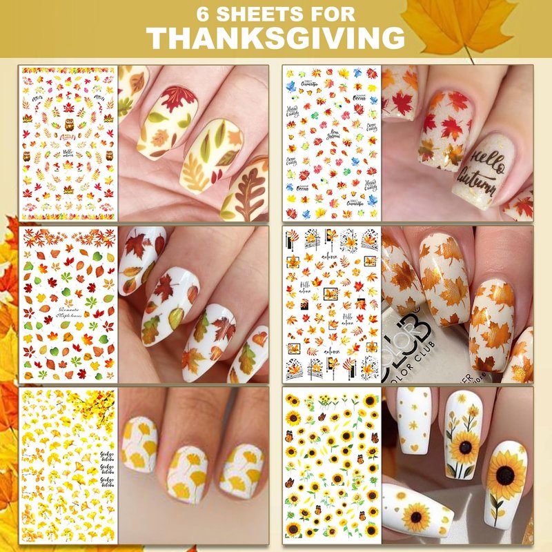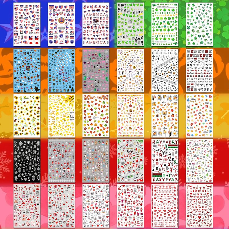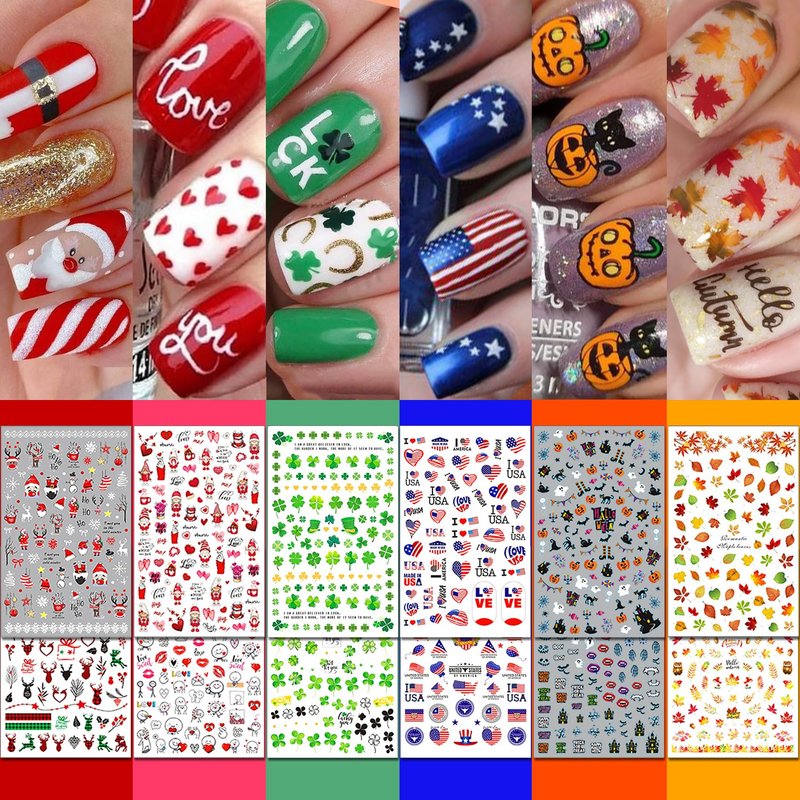 - Year-Round Fun - Grab our 30-sheet set of nail stickers for every season and holiday! With 6 sheets each for Christmas, Halloween, Thanksgiving, Valentine's Day, plus 3 for St. Patrick's Day and July 4th, you're covered all year. From pumpkins and spider webs to Santa, snowflakes, maple leaves, turkeys, hearts, four-leaf clovers, and the U.S. flag, your nails will always stand out!