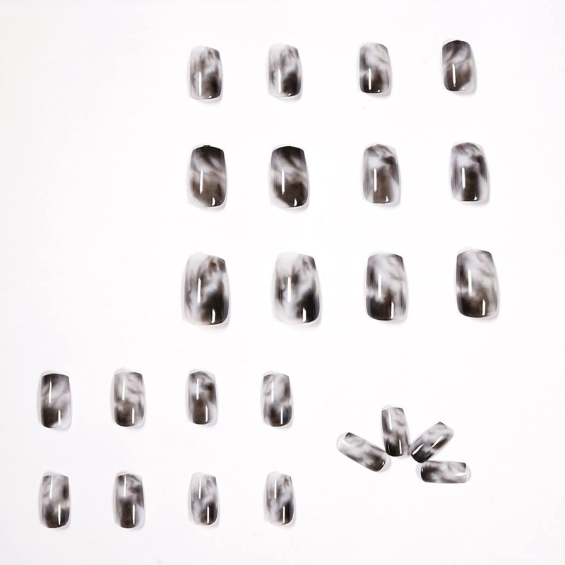 IFMOPETY 24Pcs Medium Black Coffin Press on Nails,Marble Glossy False Nails with Gradient Grey Design,Resuable Full Cover Fake Nails Set for Women,12 Sizes Nail Kit