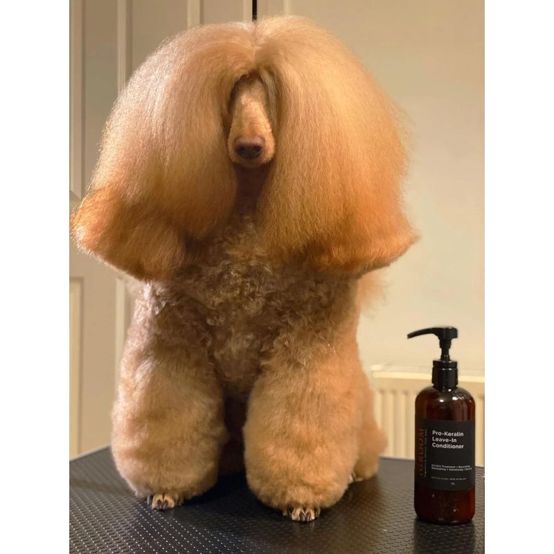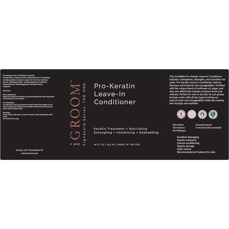 - CONDITIONER - This incredible conditioner hydrates, strengthens, detangles, and nourishes the coat. Pro-Keratin Leave-In Conditioner reduces flyaways and enhances manageability. Fortified with a blend of sunflower oil, Argan, and Aloe Vera it effectively restores moisture levels and softness.