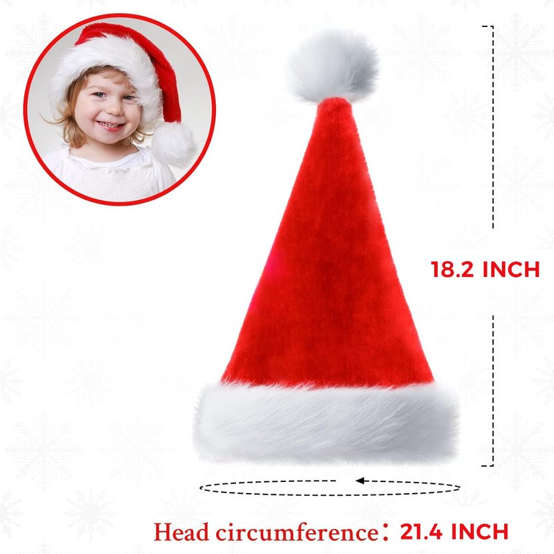 Kids Santa Hat for Boys Girls, Christmas Hats Plush Xmas Holiday Hat Luxury Santa Claus Hat, Velvet Santa Outfit Accessory for New Year Festive Party Supply, Thicken Classic Christmas Eve Ornament WARMTH & COMFORTABLE : the santa hat is soft plush, extra-thick faux fur are warm that can keep you warm. DURABLE & NON-FADING : christmas hat has the advantage of non-fading and wear-resistant, so it can be reused many times GIFT FOR YOUR FAMILY : classic style hat is beautiful with white extra-thick plush band and pom-pom topper that all your family member will love itchristmas hats for adult is made from high quality soft fabric. The thickened faux fur is going to keeps your child warm when carolling or play outside when your child wears it Dress your pets Pets are good friends of mankind. Prepare a Christmas hat for your cats, dogs or other pets at Christmas Put on a Christmas hat to welcome the HAPPY NEW YEAR ! Santa Hat Adult Christmas Hat, Unisex Santa Claus Hat Xmas Holiday Hat Santa Hat Adult Christmas Hat, Unisex Santa Claus Hat Xmas Holiday Hat HIGH QUALITY RED FUZZ This soft red plush headwear cap is carefully trimmed with a white faux fur. Moisture wicking, soft comfortable fabric Protect your head and hair without irritation or sweat! CUTE FLUFFY POM-POM Thickened design lining keep your head warm even if going out on a snowy day. Enjoying a wonderful and warm NEW YEAR ! BRING A WARM CHRISTMAS DAY Workmanship ensures to wear the Santa hats last for many seasons. A nice Halloween&Christmas Costume Accessories.It is the best gift on all kinds of parties