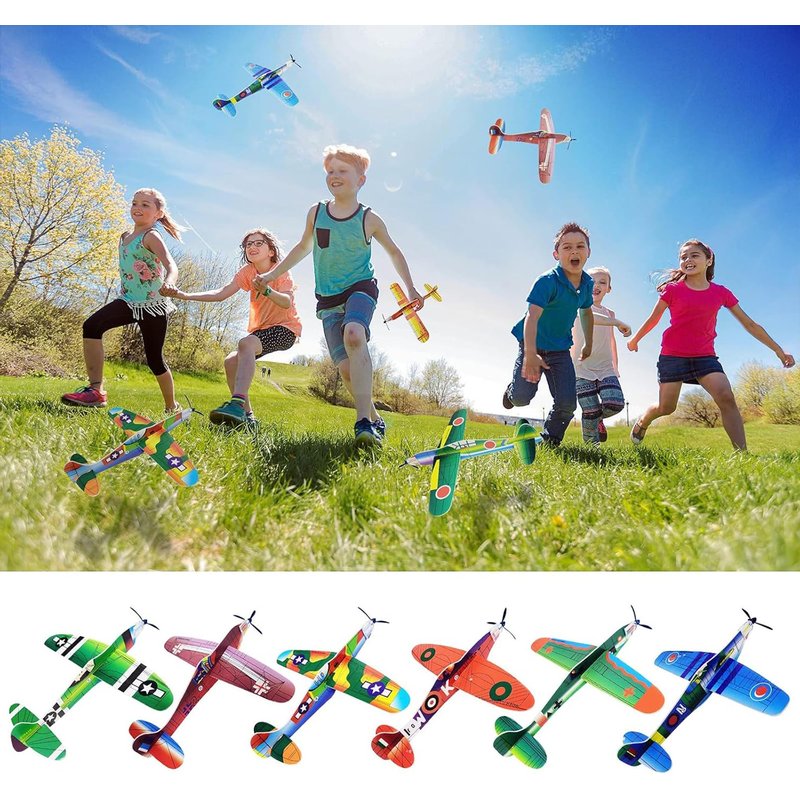 - Diverse Designs: Each package showcases a variety of aircraft models and styles, including historical and war aircraft models. Covered with foam, these gliders are sturdy, have bright, vivid colors that won't fade, and are 8 inches long. The glider soars through the air with its propellers spinning. With propellers spinning in the air, these gliders will enchant children compared to real airplanes.