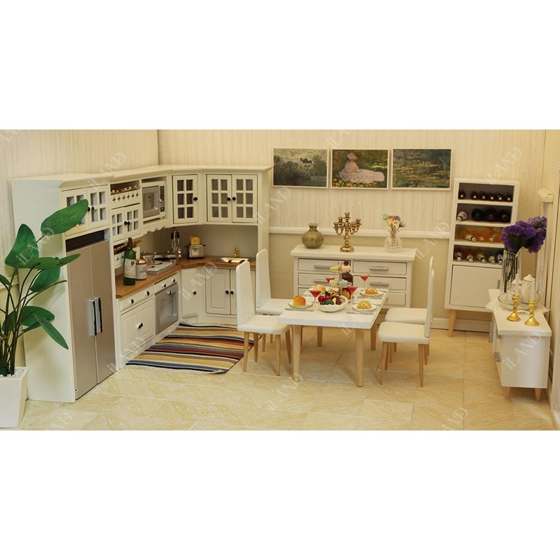 - AMAZING DOLLHOUSE KITCHEN SET: This miniature dollhouse kitchen set includes the complete kitchen cabinets set, oven, microwave, refrigerator, pots and pans set, and 1 woven carpet, which is an ideal one-time solution for dollhouse kitchen furniture and accessories, making a luxury modern mini kitchen easily.