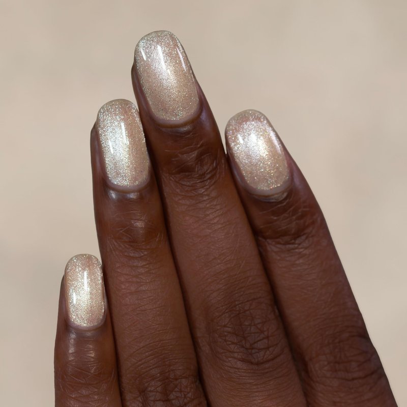 Cashmere is a cashmere beige magnetic delicately woven with silver flakes and holographic sparkle. Embrace the luxury of Cashmere, a soft and delicate beige hue with a glowing surprise. With a brush of the magnet, Cashmere’s subdued base transforms and reveals a riveting depth of silver magnetic sparkle that dances across the nails like sunbeams caressing the plush surface of a cashmere blanket. Cashmere is part of the Velvet Collection, an assembly of 6 magnetic nail polishes, each elegantly laced with holographic flakes and silver magnetic sparkle that mirrors the lavish and comforting textures of fine velvet. Designed to evoke the sensory pleasures of plush, velvety fabrics and the gentle allure of Spring's subtleties, Velvet immerses you in a delicate dance of shimmering light and calming hues. Cashmere is a magnetic effect nail polish, a standout formula with metal shavings that shimmer on their own but require a magnet to attract the metallic particles into their signature effect! Magnetic Wand sold separately. We recommend 2-3 coats for the ideal finish