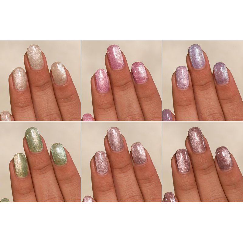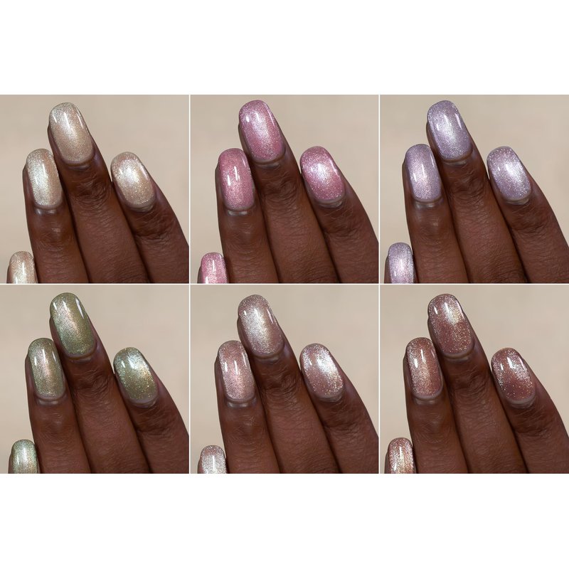 - GLISTENING VELVET-INPSIRED NAIL POLISHES - An assembly of 6 magnetic nail polishes, each elegantly laced with holographic flakes and silver magnetic sparkle that mirrors the lavish and comforting textures of fine velvet. MAGNETIC WAND NOT INCLUDED IN LISTING.