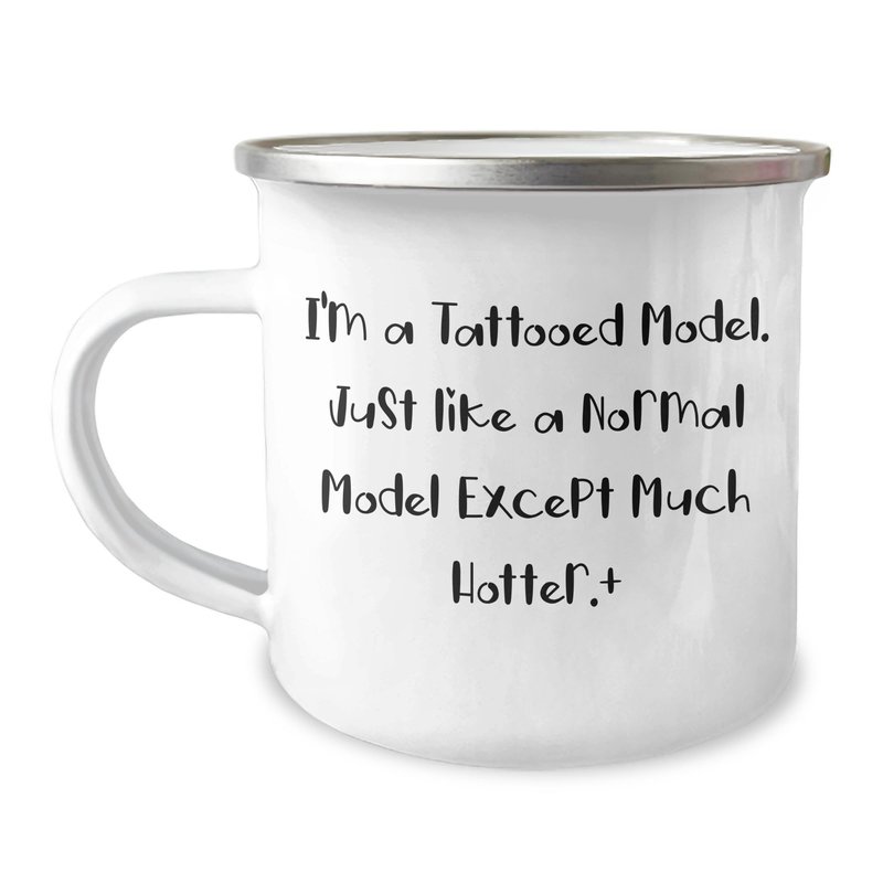 - Show off your love for models with this unique camping mug, designed to make a statement. This quote 'I'm A Tattooed Model. Just Like A Normal Model Except Much Hotter.+' is a bold statement that shows you're a fan of their unique style, and this mug is the perfect way to express that.